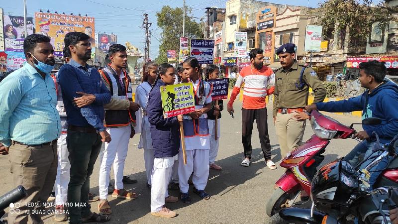 शहर में लगातार बढ़ती जा रही सड़क दुर्घटनाओं में कमी लाने के लिए यातायात विभाग द्वारा निरंतर जागरूकता अभियान चलाए जा रहे है इसी को देखते हुए जिला मुख्यालय पर हुई आवश्यक बैठक में कलेक्टर मयंक अग्रवाल और एसपी सूरज कुमार वर्मा के निर्देश पर शहर में हर शनिवार को यातायात विभाग द्वारा शहर के चौराहो पर स्कूली बच्चों के साथ मिलकर यातायात जागरूकता अभियान चलाया जा रहा है जिसको लेकर आज भी यातायात विभाग द्वारा स्कूली बच्चों के साथ मिलकर शहर के विजय टाकीज़ चौराहे पर आम नागरिको को हेलमेट लगाने और सीट बेल्ट बांधने सहित आवश्यक जानकारियां दी गई, वही विभाग द्वारा बिना नंबर वाले वाहन चालकों के खिलाफ कार्यवाही की गई। वही यातायात प्रभारी मोहन भरावर्त ने जानकारी देते हुए बताया कि माननीय उच्च न्यायलय के निर्देश और जिला मुख्यालय पर हुई आवश्यक बैठक में जिलाधीश एवं पुलिस अधीक्षक द्वारा दिए गए निर्देश के पालन में प्रत्येक शनिवार को शहर में जागरूकता अभियान चलाया जाना है उसी के परिपालन में आज स्कूल के बच्चों के साथ मिलकर विजय टॉकीज चौराहे पर यातायात नियमो को लेकर जागरूकता अभियान चलाया गया और स्कूली बच्चों के द्वारा आम नागरिको को जागरूक किया जा रहा है इस दौरान बिना नंबर वाहन चलाने वाले को भी रोका गया और जिनके दस्तावेज जांचे जा रहे है और दस्तावेज पुरे नहीं होने पर उचित कार्यवाही की जाएगी।
